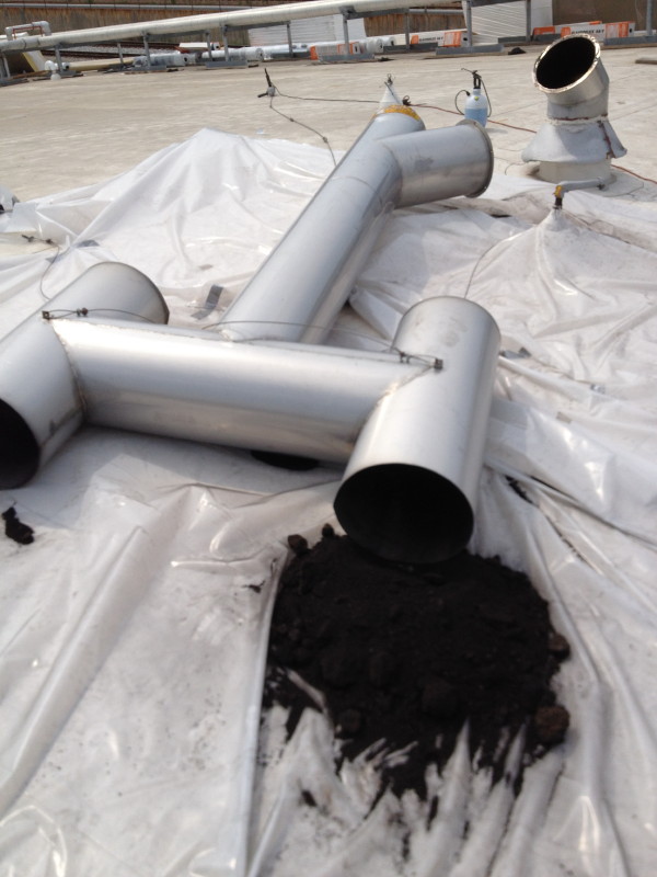 You’re looking at almost an inch of debris accumulation inside the ductwork and exhaust fan from an industrial oven.