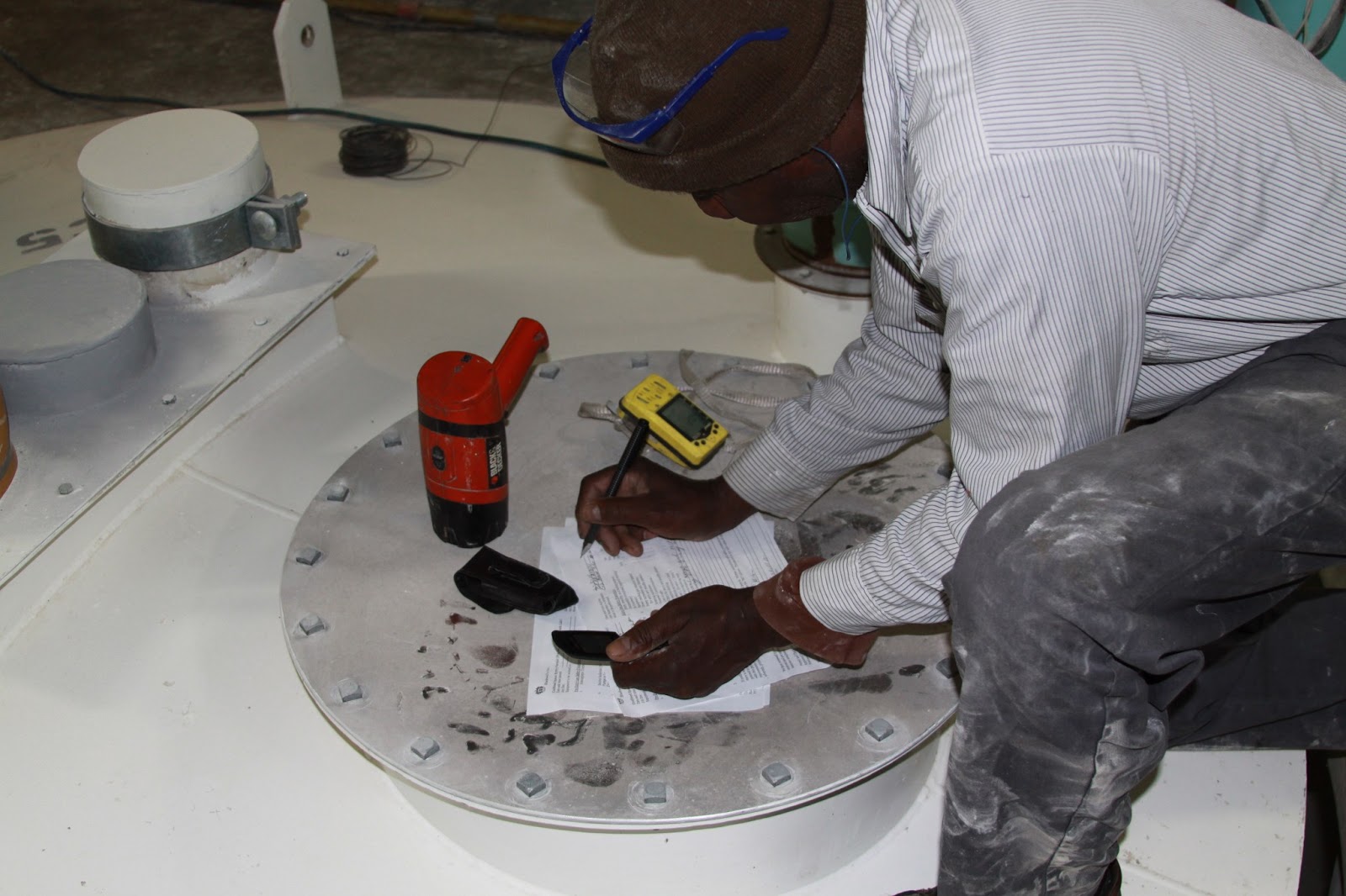 | A member of the support team completing the “pre-entry” documentation. This hatch cover is to an adjacent silo. |